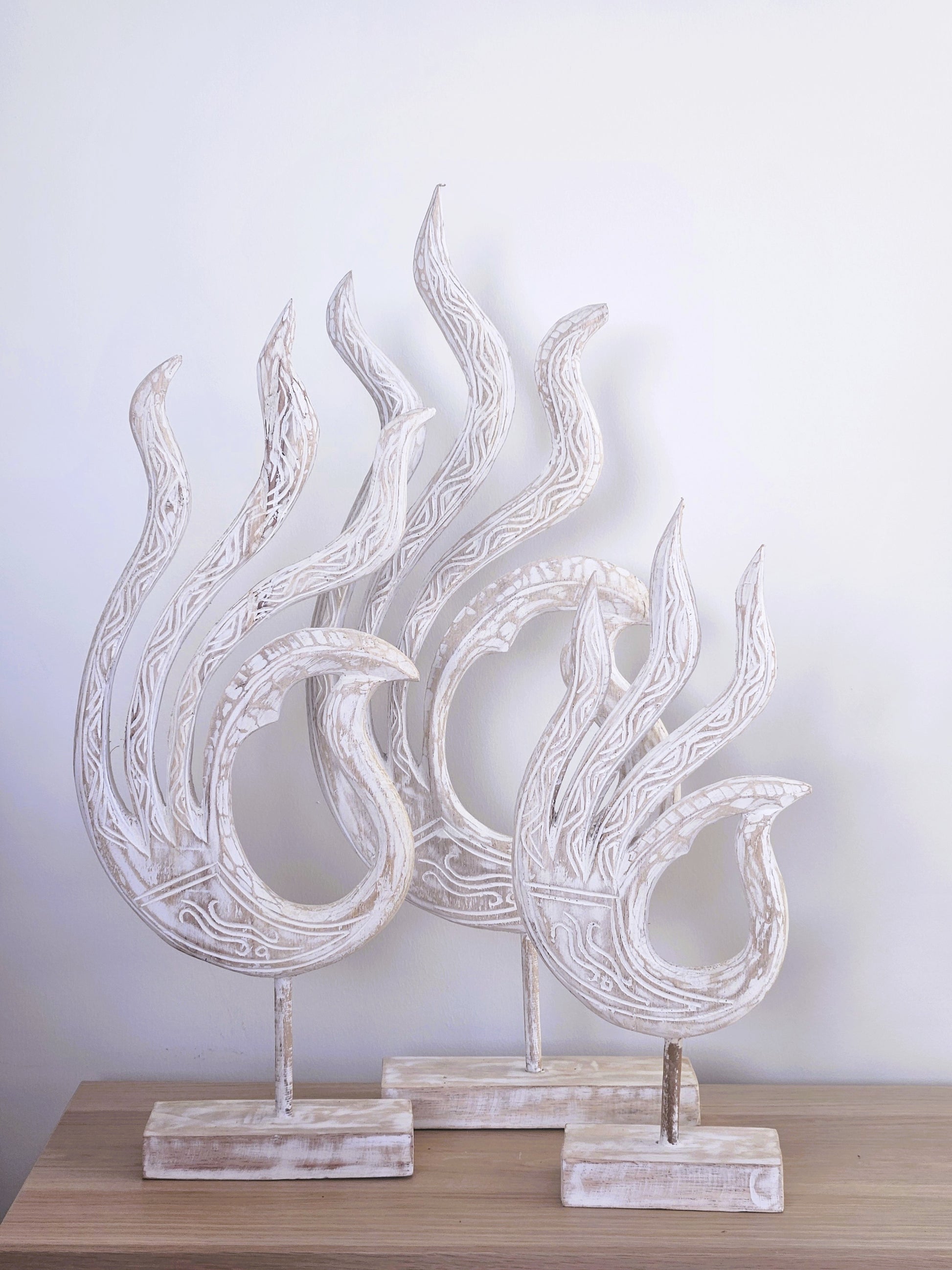 El Lidah Api es un conjunto hipnotizante que rinde homenaje a la belleza del fuego, elegantemente esculpido por artesanos balineses. Inspirado en el movimiento fluido de las llamas, cada pieza de este conjunto de tres captura la esencia de la energía y la transformación. El nombre "Lidah Api," que significa "lengua de fuego" en indonesio, refleja perfectamente las formas dinámicas y escultóricas de estas obras de arte en madera.