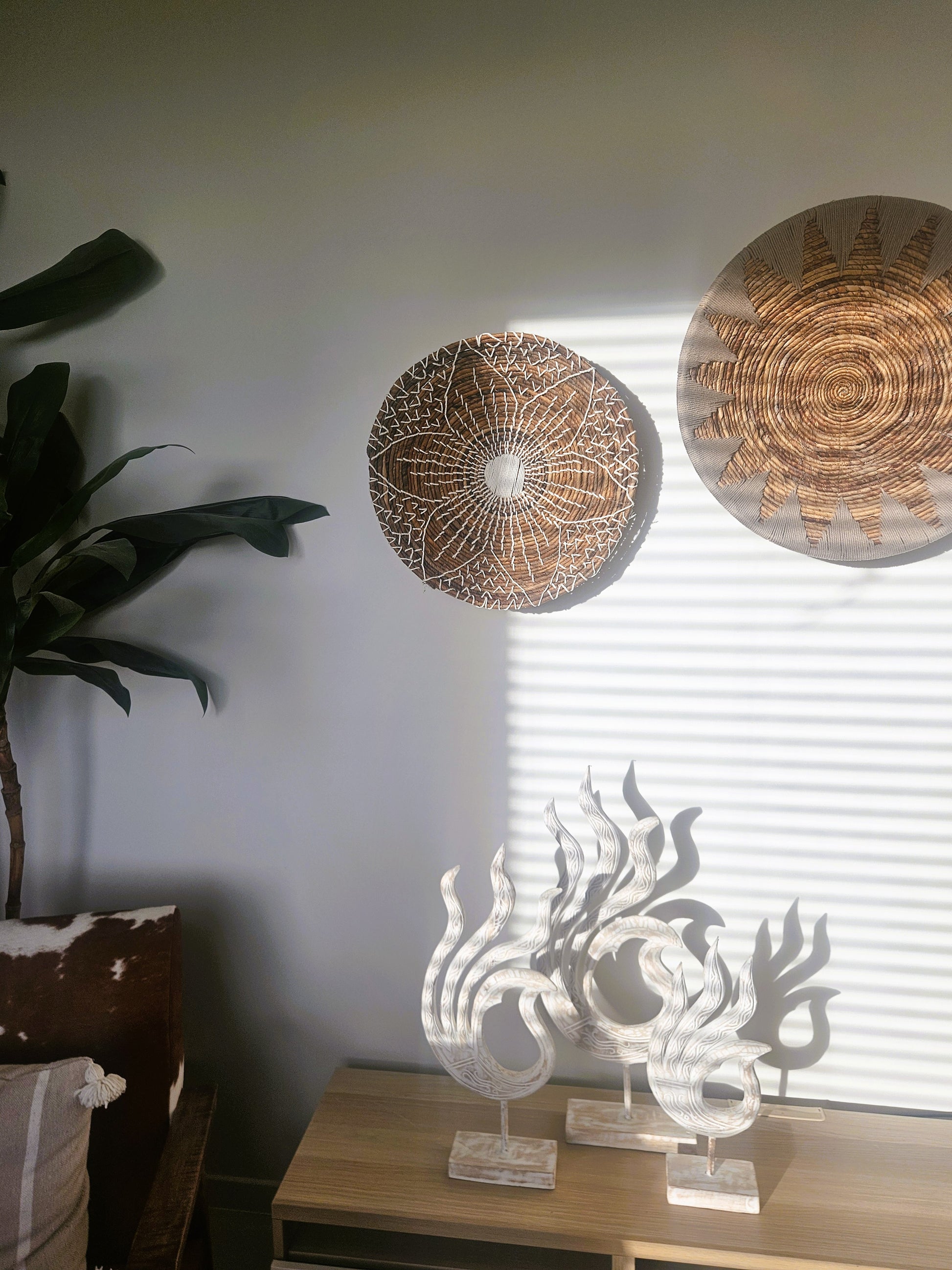 Lleva un toque floral de Bali a tu hogar con la decoración de pared Salvia, una pieza impresionante hecha a mano con fibras naturales de Mendang. Extraídas de la corteza de plantas tropicales, estas fibras son conocidas por su flexibilidad, durabilidad y propiedades ecológicas, ideales para el tejido artesanal. El diseño floral combina tonos terrosos con un trabajo delicado, creando un punto focal que transmite calidez y belleza natural.