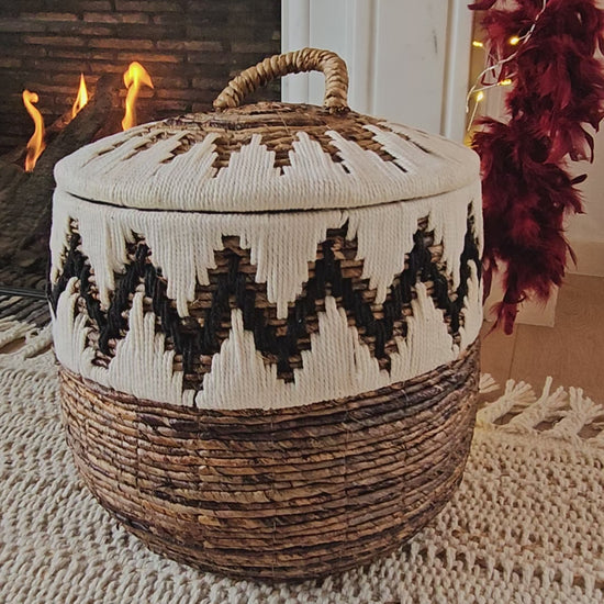 Apportez une touche naturelle et élégante à votre intérieur avec le panier de rangement Samuel, une pièce magnifiquement tissée à la main qui allie fonctionnalité et charme bohème. Fabriqué en abaca durable et orné d'un cordon décoratif en coton noir et blanc dans un motif en zigzag en V raffiné, ce panier est à la fois pratique et un véritable accroche-regard.