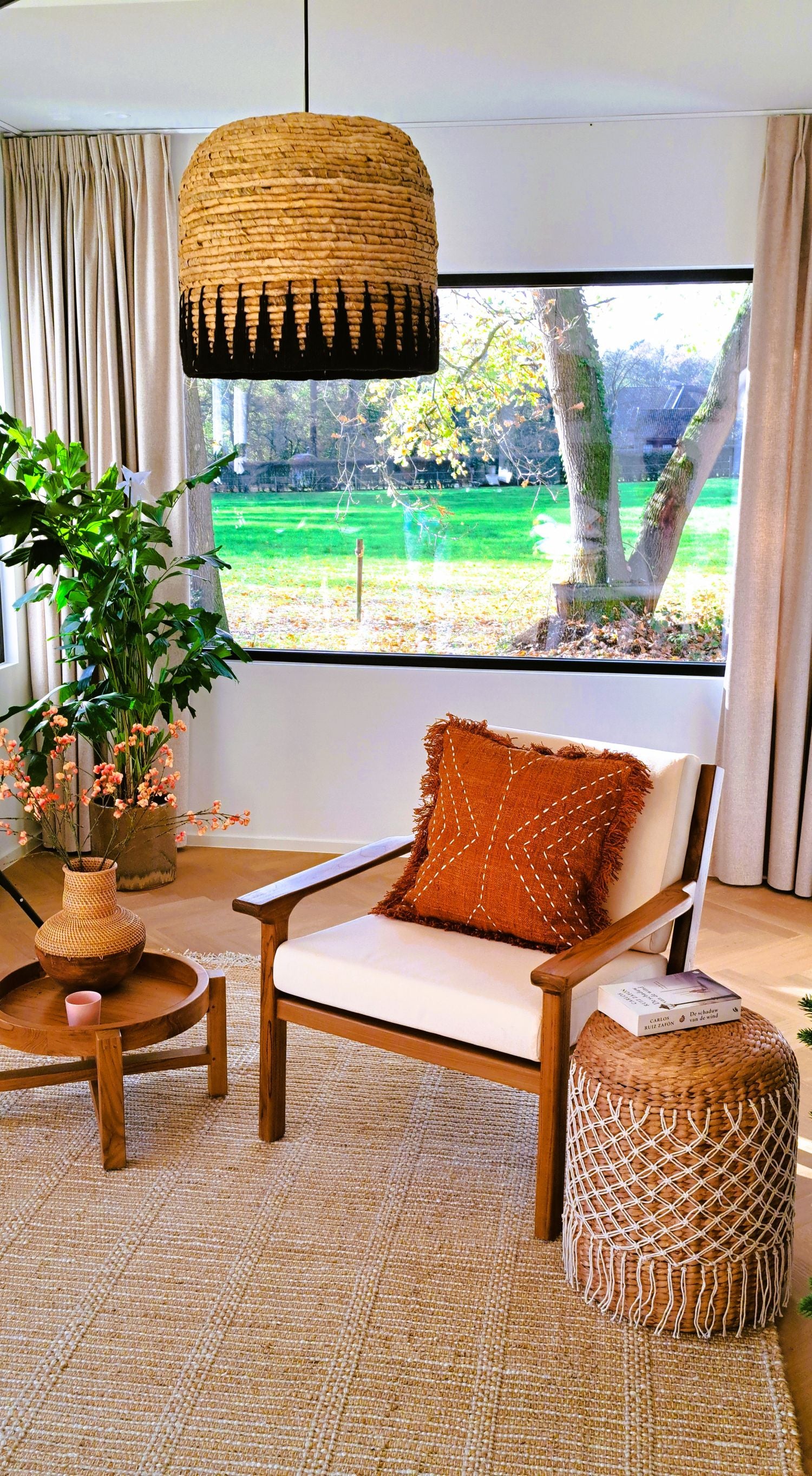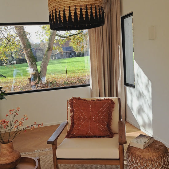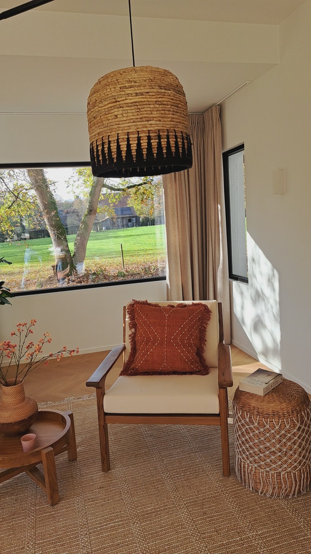 Eleva il tuo spazio con la lampada a sospensione Durian, una combinazione sorprendente di materiali terrosi e design boho contemporaneo. Intrecciata a mano con fibre naturali di abaca e rifinita con un audace dettaglio in corda di cotone nera, questa lampada è un vero pezzo d'affermazione che porta calore, ritmo e texture in ogni interno.