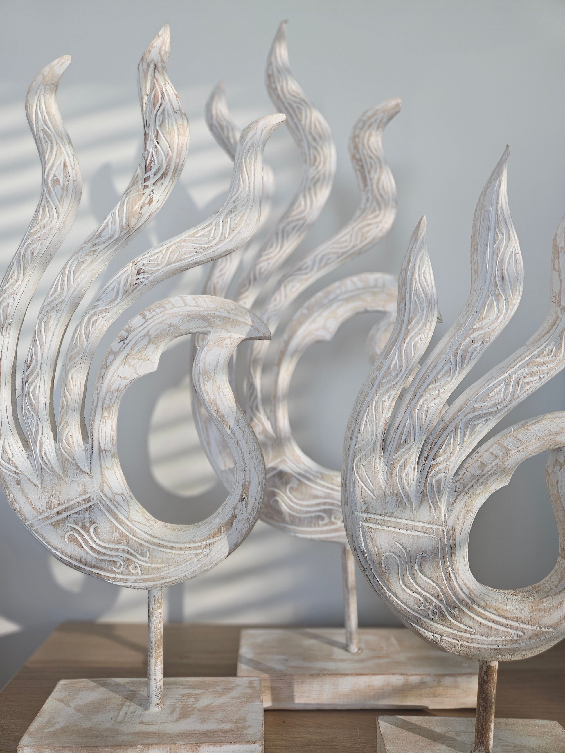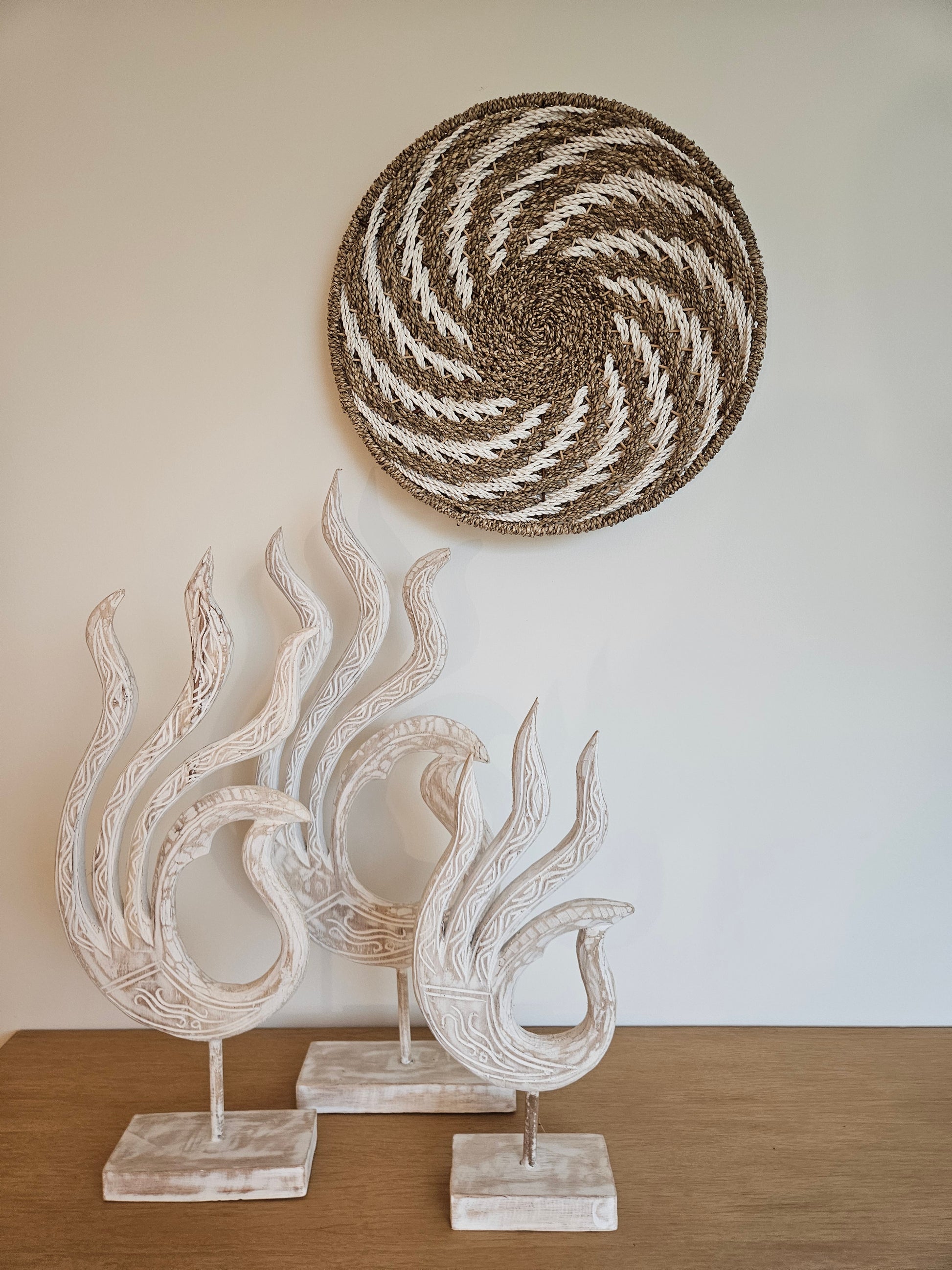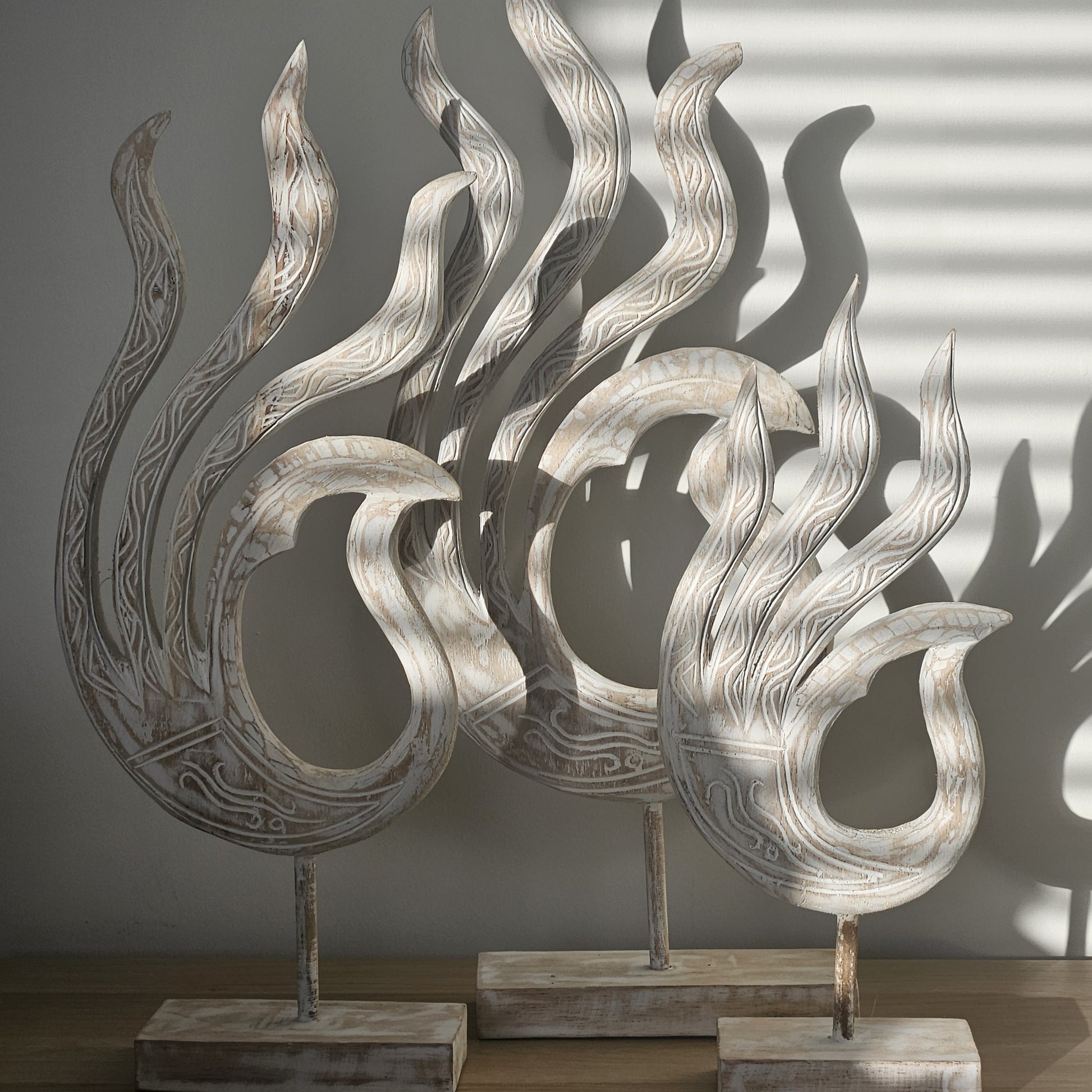 De Lidah Api set is een betoverende ode aan de schoonheid van vuur, elegant gebeeldhouwd door Balinese ambachtslieden. Geïnspireerd door de vloeiende beweging van vlammen, vangt elk stuk in deze set van drie de essentie van energie en transformatie. De naam "Lidah Api," wat "vuur tong" betekent in het Indonesisch, weerspiegelt perfect de dynamische, sculpturale vormen van deze houten kunstwerken.