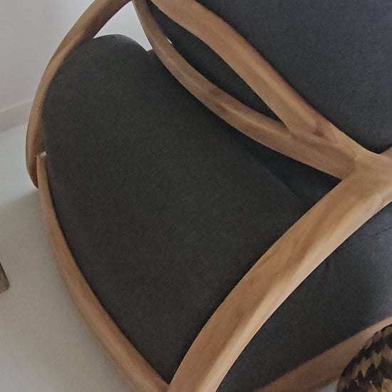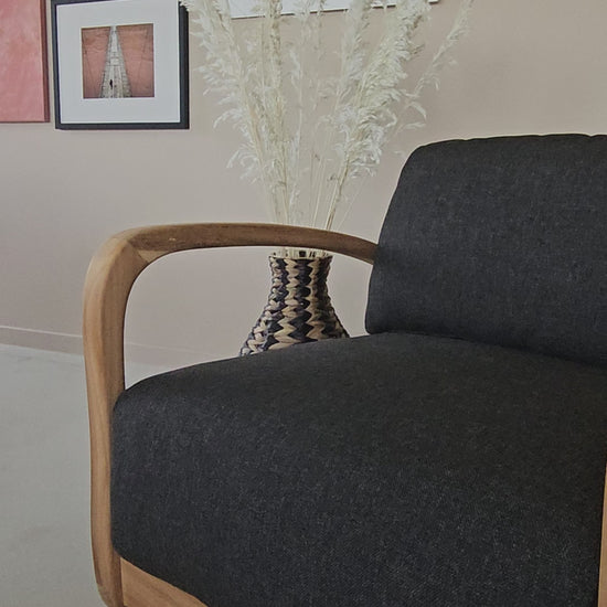 Crafted on the island of Java, the Adrian Lounge Chair brings together sculptural elegance and laid-back boho vibes. Its bold organic frame is made from sustainably sourced plantation teak – left unfinished to showcase the raw natural grain. The generous seat and backrest are upholstered in high-quality fabric, supported by a firm, solid foam insert for ultimate comfort.
