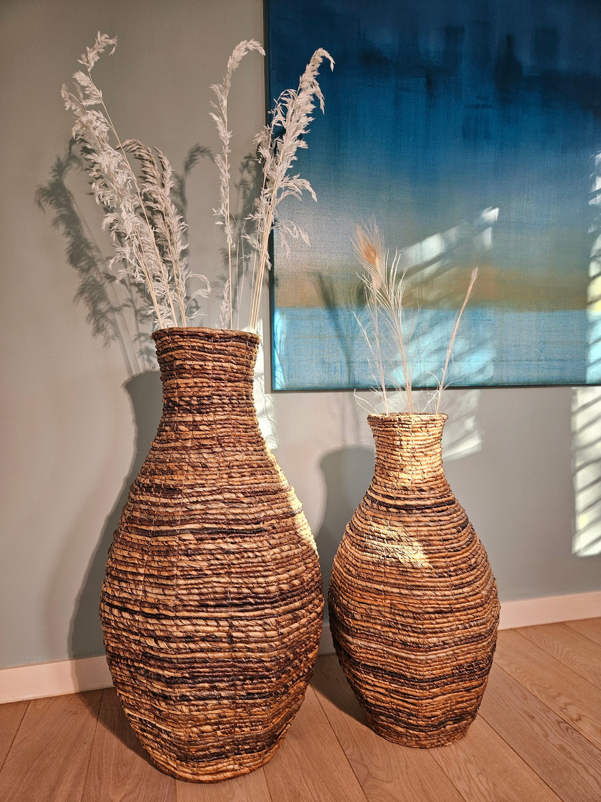 Meet Amando L, the 60 cm tall handcrafted vase that brings a touch of sun-drenched serenity to your space. Woven with natural abaca fibers, Amando’s soft curves and warm earthy tones add a natural elegance to every corner of your home. Whether placed solo or styled in a group, it’s a true eye-catcher for lovers of boho and Ibiza-style living.