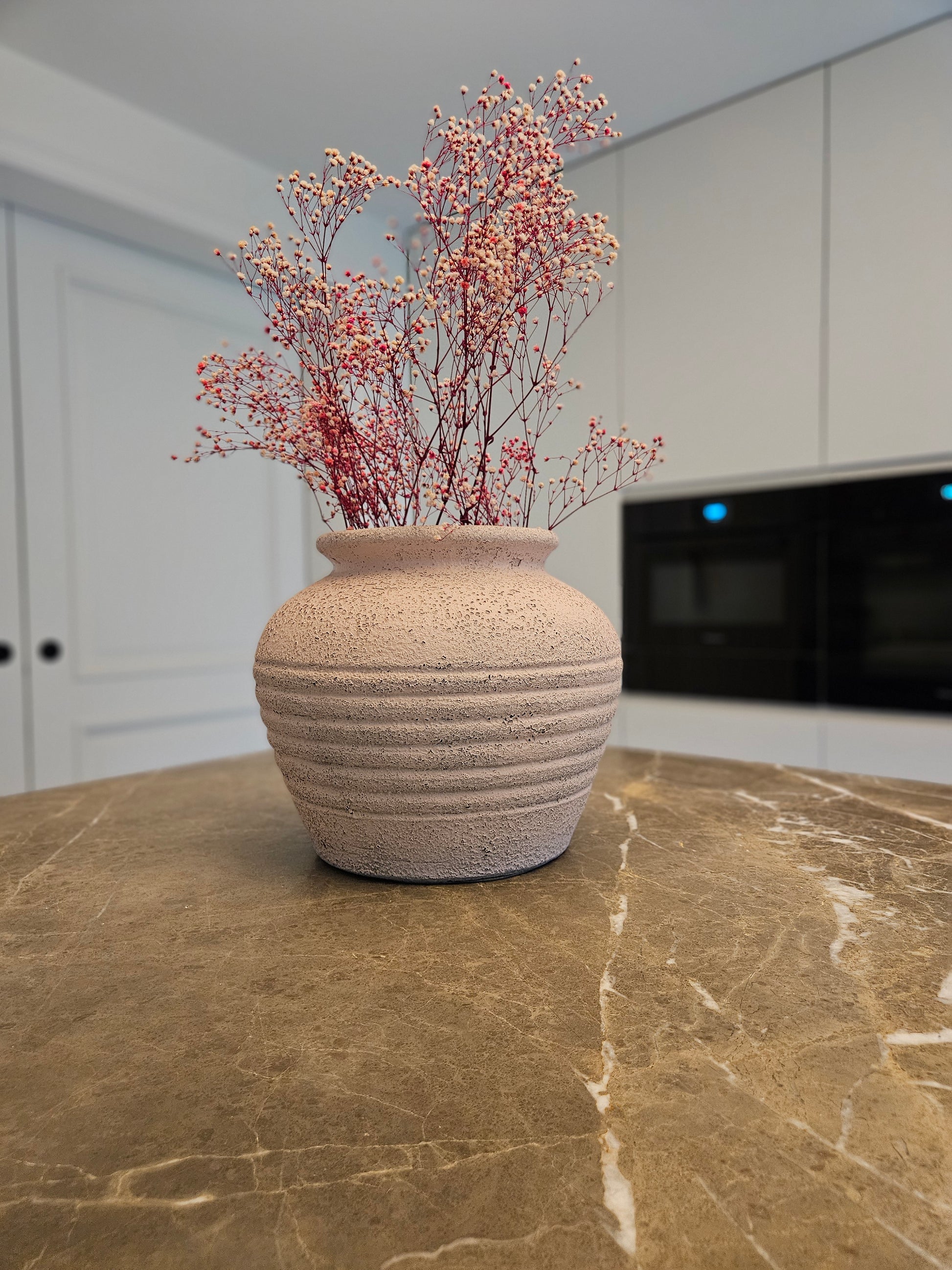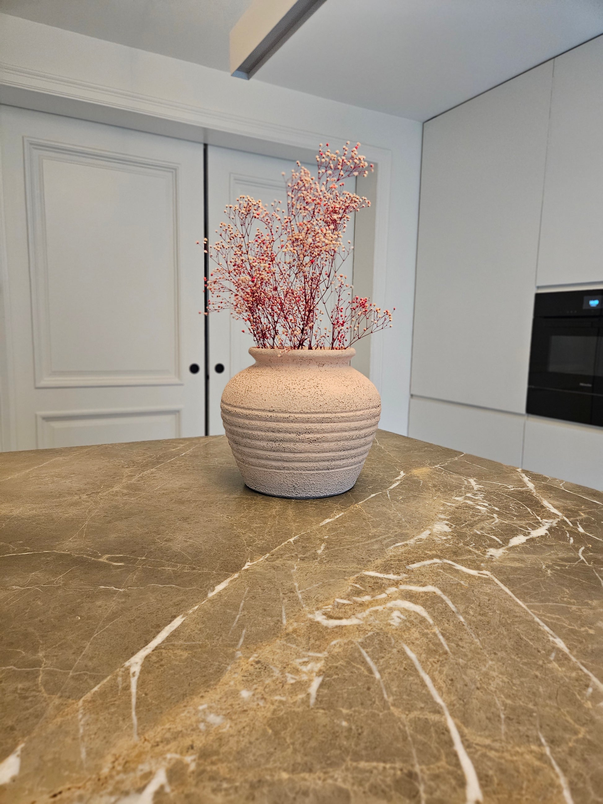 Use it as a decorative piece or combine it with dried flowers for a rustic feel. For fresh blooms, simply place a glass jar or cut plastic bottle inside. Available in two sizes — the smaller, fuller Elisa version and the taller, more slender Luisa design — and three calming tones: Rosa, Crema, and Eucalipto.