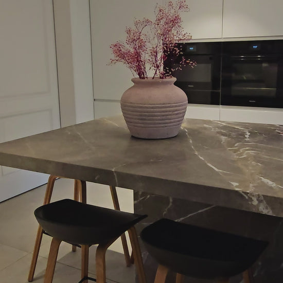 Its rough-textured surface, minimalist ribbed design, and muted, nature-inspired hues evoke the warmth of handmade tradition. Whether styled as a standalone statement or paired with its sisters from the same family, this vase instantly elevates your shelf, console or dining table with organic charm.