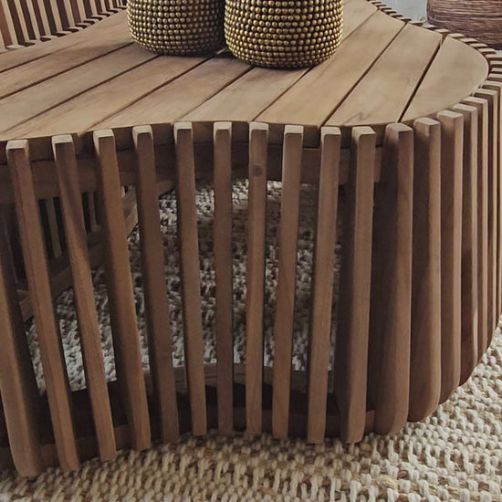 The Isidro Alto coffee table is a celebration of organic curves, natural materials, and timeless design. Handmade in Java from unfinished teak wood, it stands tall and confident, with vertical wooden ribs and an asymmetrical form that brings movement and flow to your space.