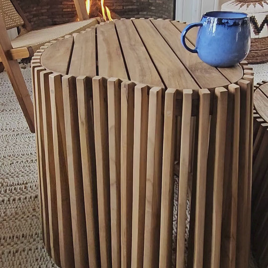 The Isidro Bajo coffee table blends natural beauty with contemporary craftsmanship, offering a sculptural silhouette that instantly draws the eye. Handmade in Java from unfinished plantation teak, it features an organic, irregular shape and vertical slats that add rhythm and lightness to the design.