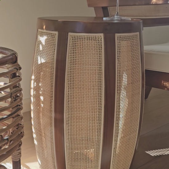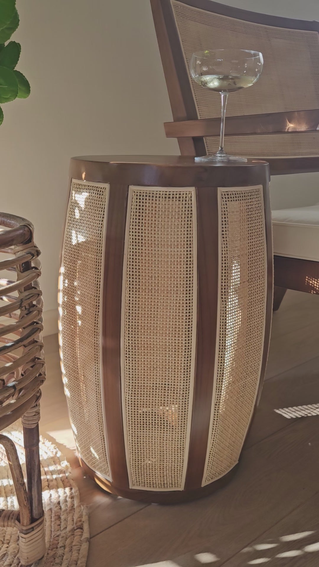 The rounded, barrel-shaped silhouette is both elegant and grounded, showcasing alternating panels of solid teak and handwoven rattan cane. The contrast between the rich wood grain and the light, airy weave creates a refined yet relaxed feel that suits boho, natural, or modern interiors alike.