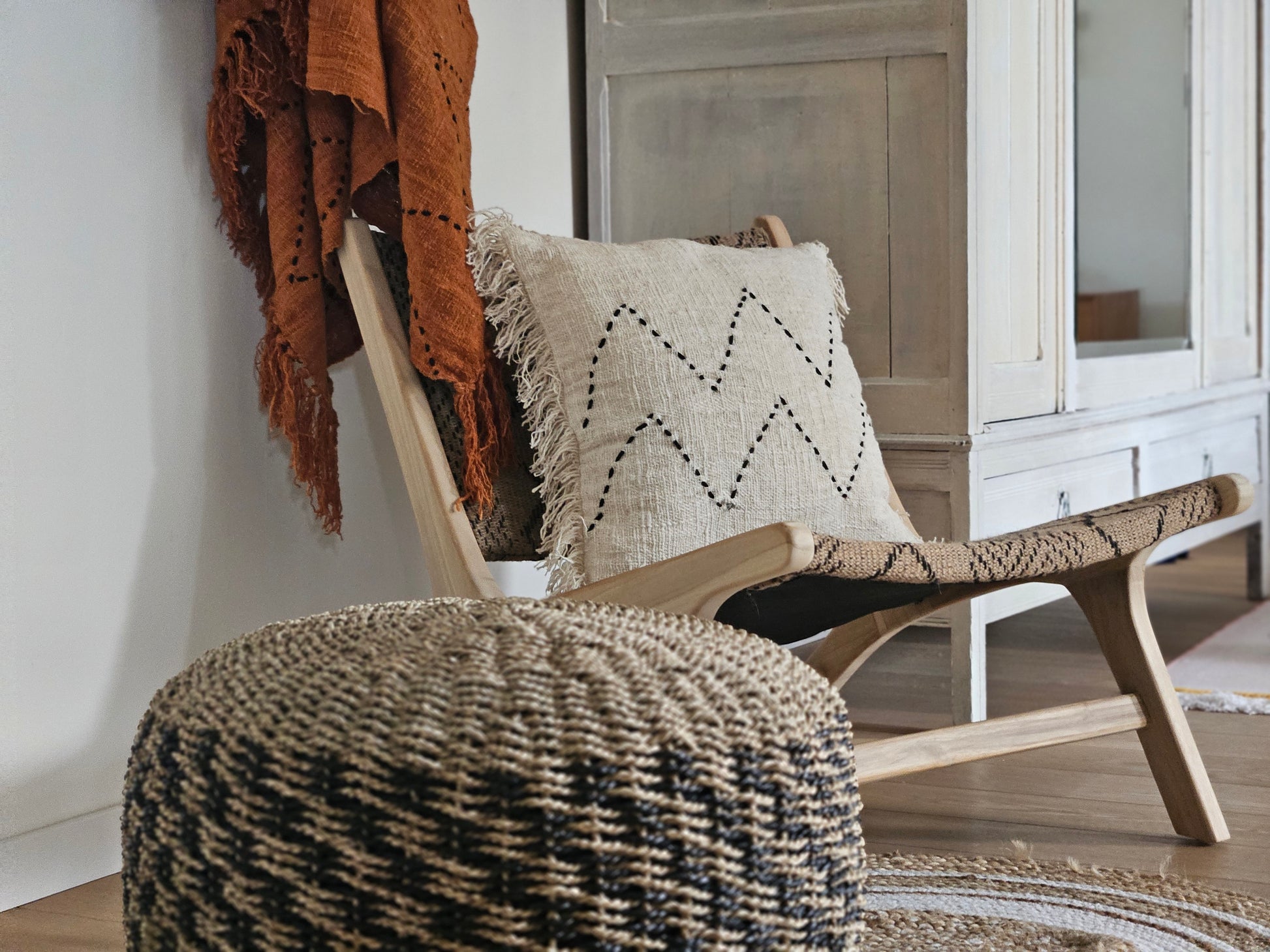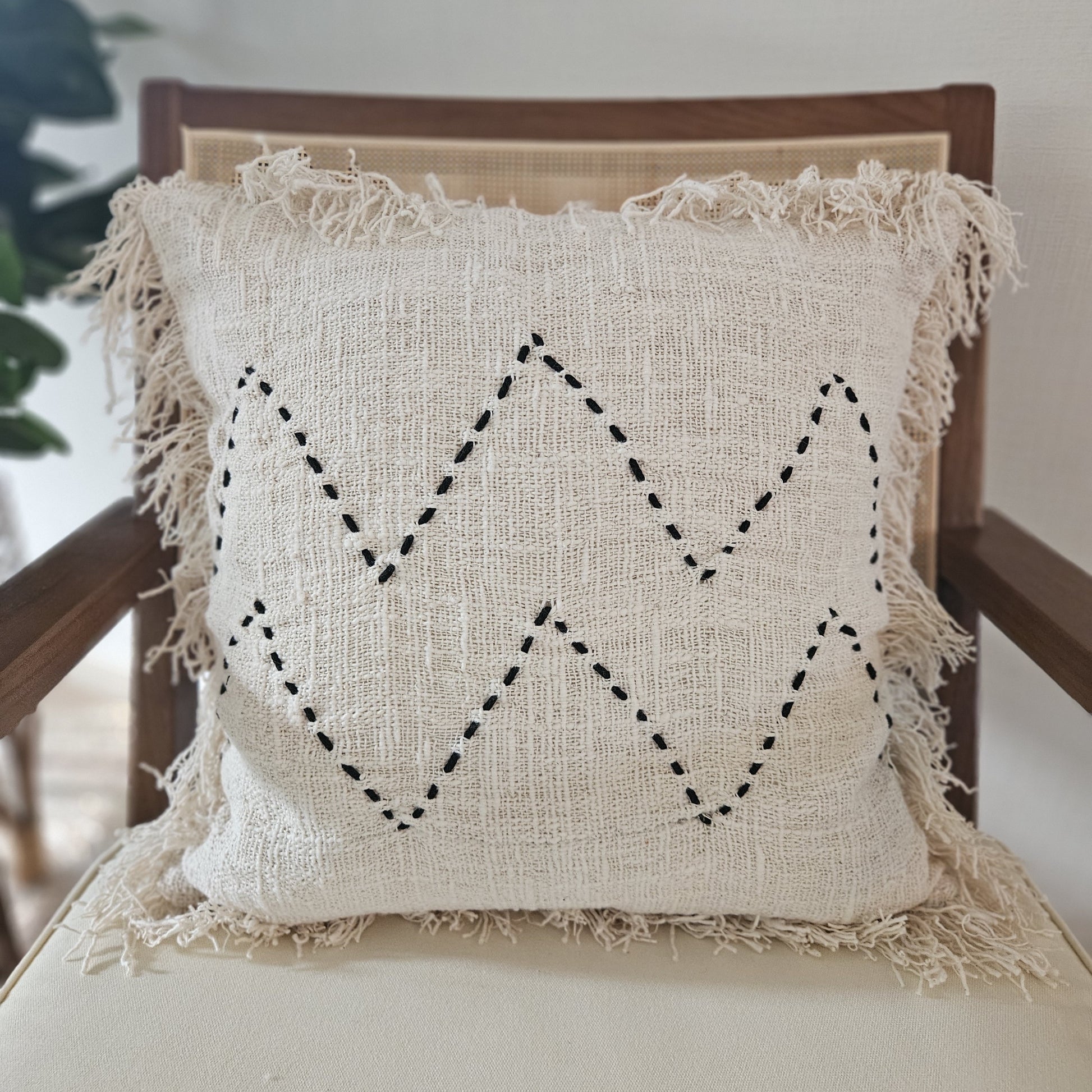 The delicate zigzag embroidery, inspired by traditional craftsmanship, adds a subtle yet stylish detail, while the fringed edges enhance its artisanal appeal. Its organic feel makes it a versatile piece that blends seamlessly into minimalist, bohemian, or Scandinavian-inspired interiors.